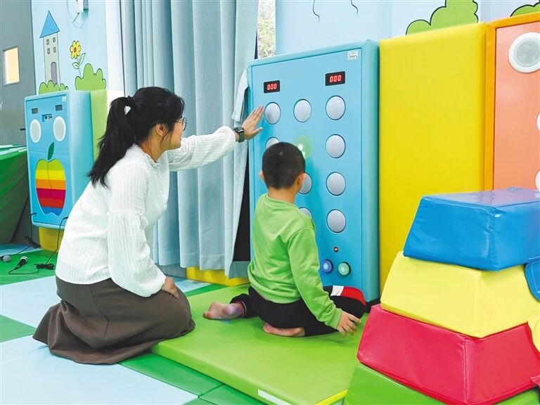 唐氏综合征患儿亮亮(化名),长着一双清澈的圆眼睛,一听老师夸自己便露出羞涩的笑容。他刚来时手脚不协调,走路偶尔摔倒,经过康复训练后,肢体的控制能力显著提升,如今走路稳稳当当。