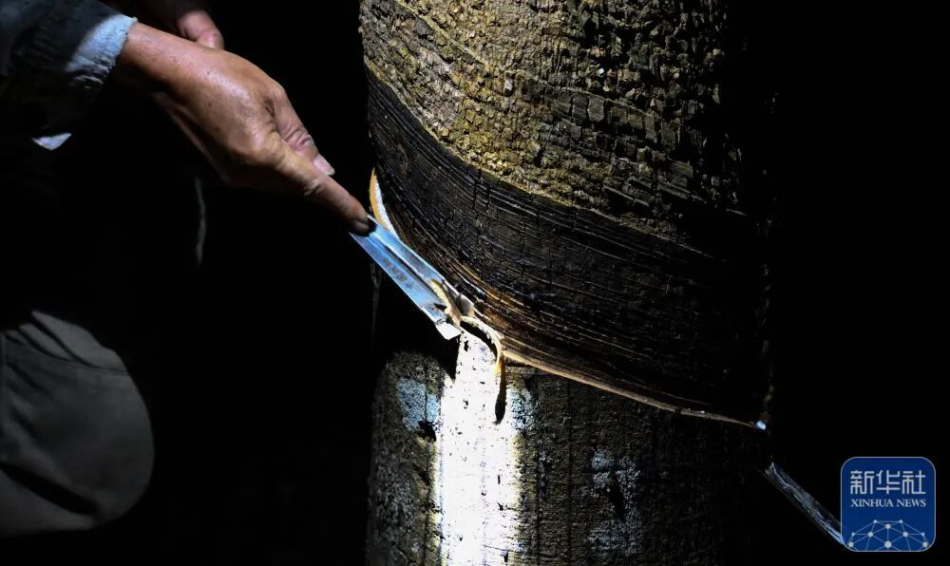 ↑ 海南省白沙黎族自治县牙叉镇新高峰村的胶农在割胶(11月19日摄)。