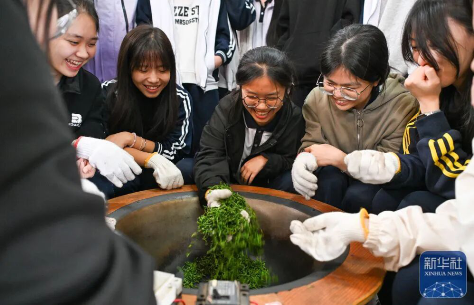 ↑ 在海南省白沙黎族自治县五里路茶园,学生在体验炒茶(11月20日摄)。