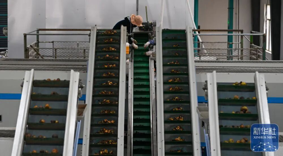 ↑ 在海南省白沙黎族自治县邦溪镇的闻儒生物科技(海南)有限公司,工人在车间内处理油茶果(11月19日摄)。