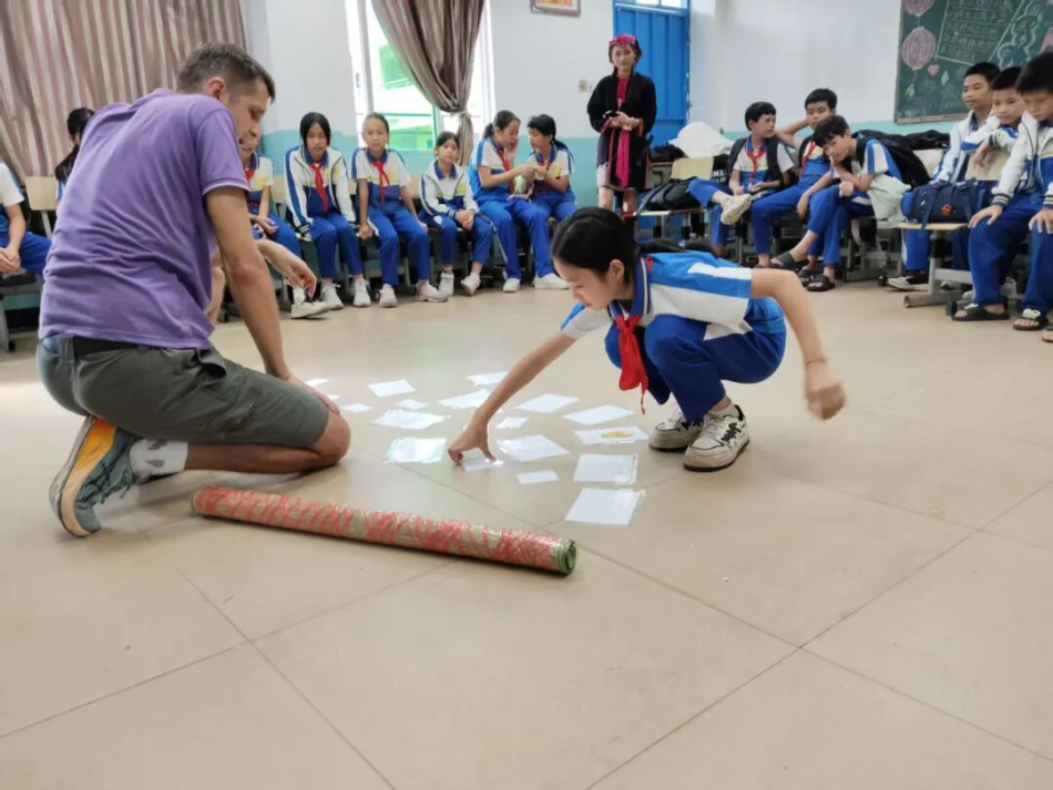 当天,“闪耀之星”支教公益行系列之国际人才乡村支教活动在这里拉开帷幕。作为主办单位之一,海口国际人才志愿服务团、海口国际人才之家外国专家书屋选派了符积虎等3名优秀国际人才志愿支教者,为该校四至六年级学生带来了一堂生动有趣的英语兴趣课。