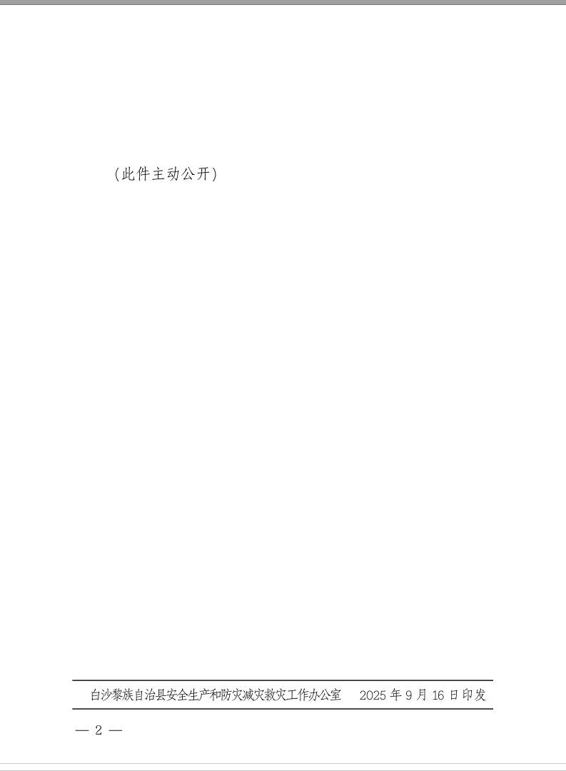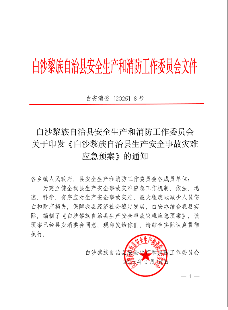 标题:白沙黎族自治县安全生产和消防工作委员会关于印发《白沙黎族自治县生产安全事故灾难应急预案》的通知