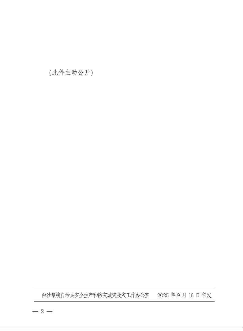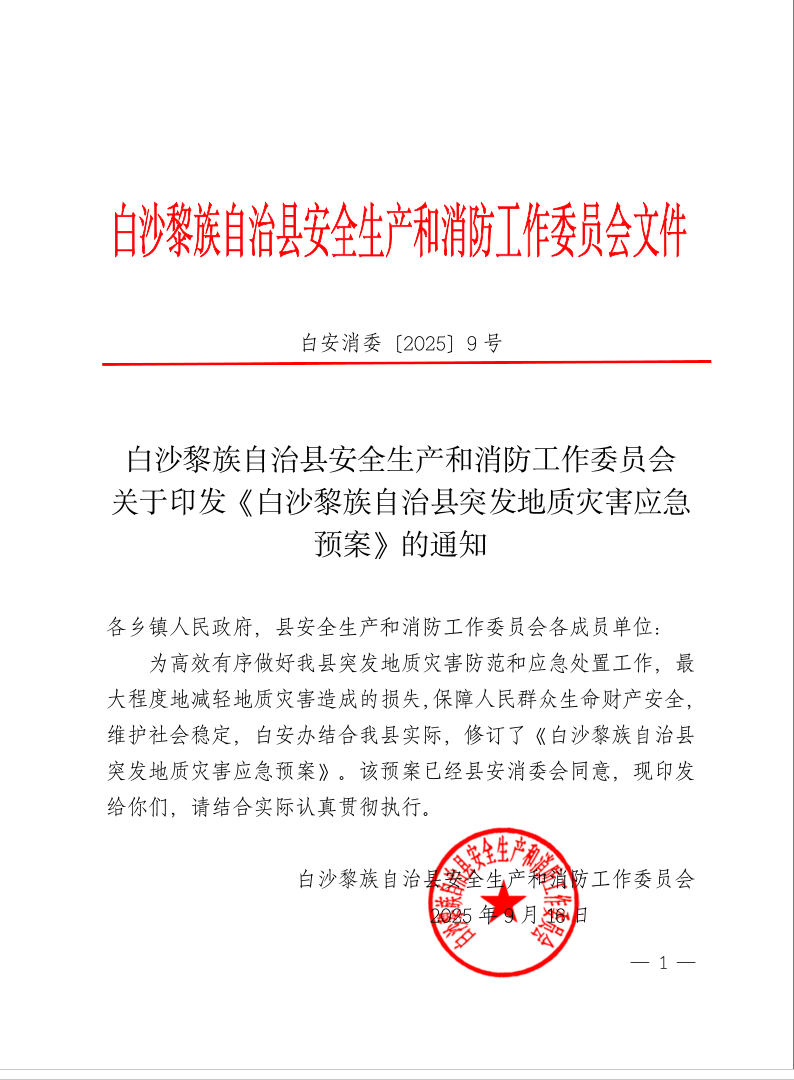 标题:白沙黎族自治县安全生产和消防工作委员会关于印发《白沙黎族自治县突发地质灾害应急预案》的通知