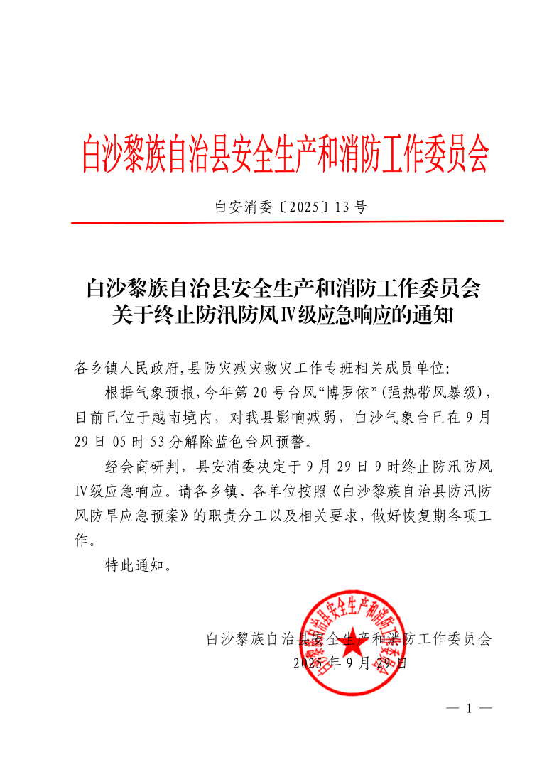标题:白沙黎族自治县安全生产和消防工作委员会关于终止防汛防风Ⅳ级应急响应的通知